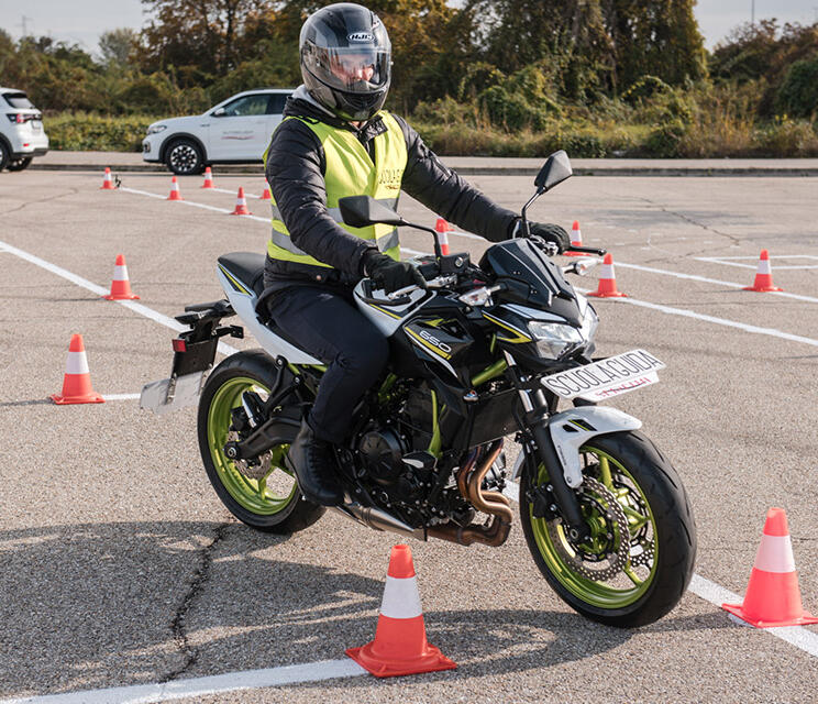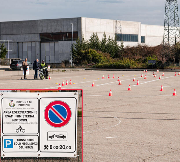 Le prove pratiche di guida su moto sono organizzate in un circuito protetto a Poirino (Torino) per garantire la massima sicurezza e il miglior apprendimento
